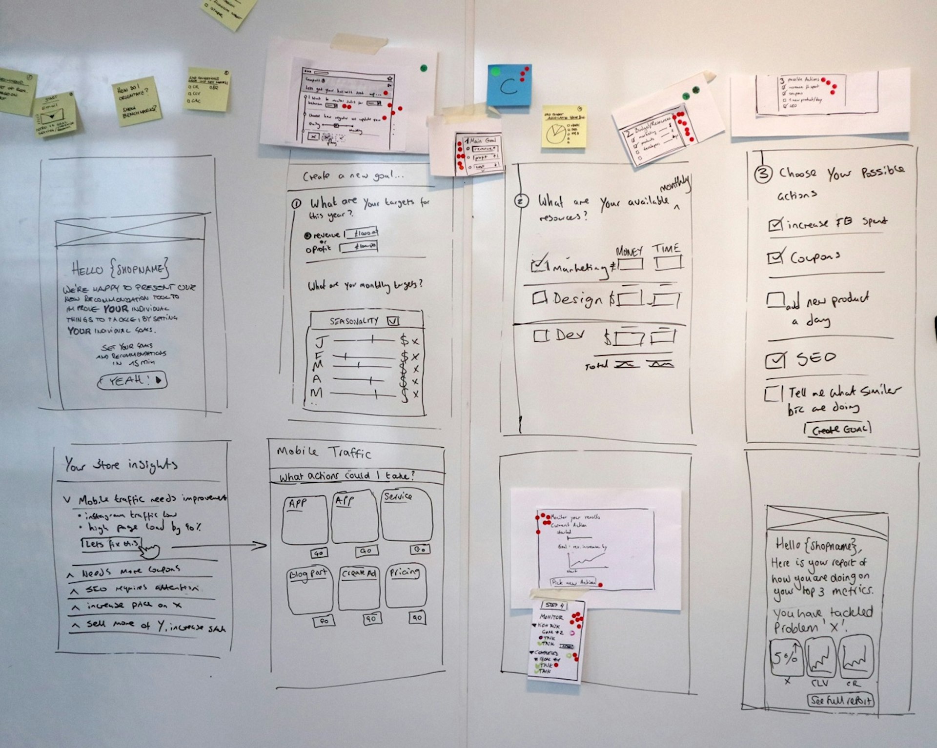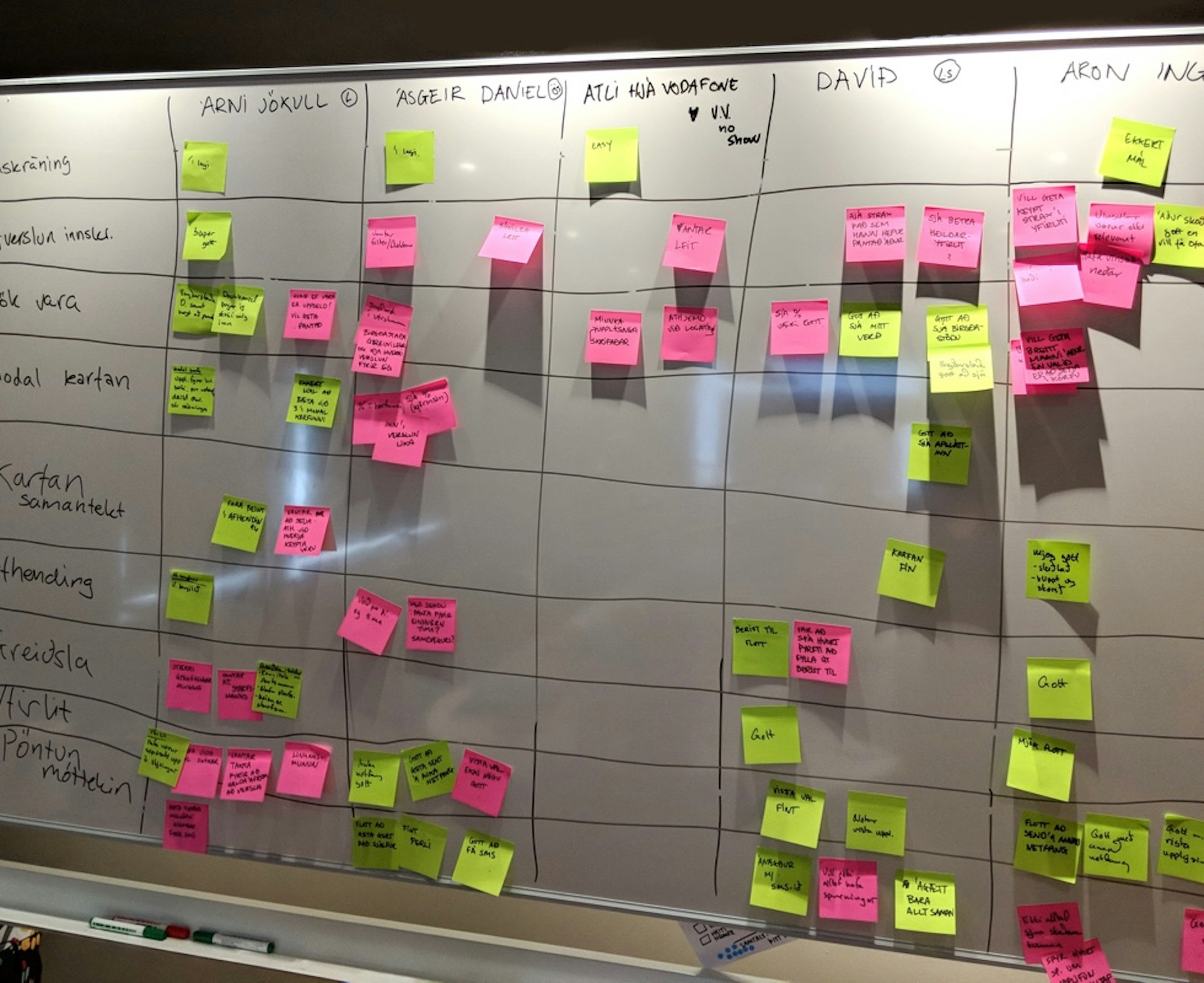 Á fyrsta degi skilgreinum við hverjar áskoranirnar eru með aðferð sem hjálpar okkur að koma auga á tækifærin sem leynast í þeim. Einnig setjum við okkur markmið og gerum fyrsta uppkast að notendaflæðinu. Til að komast að niðurstöðu fer fram kosning þar sem allir í teyminu taka þátt.