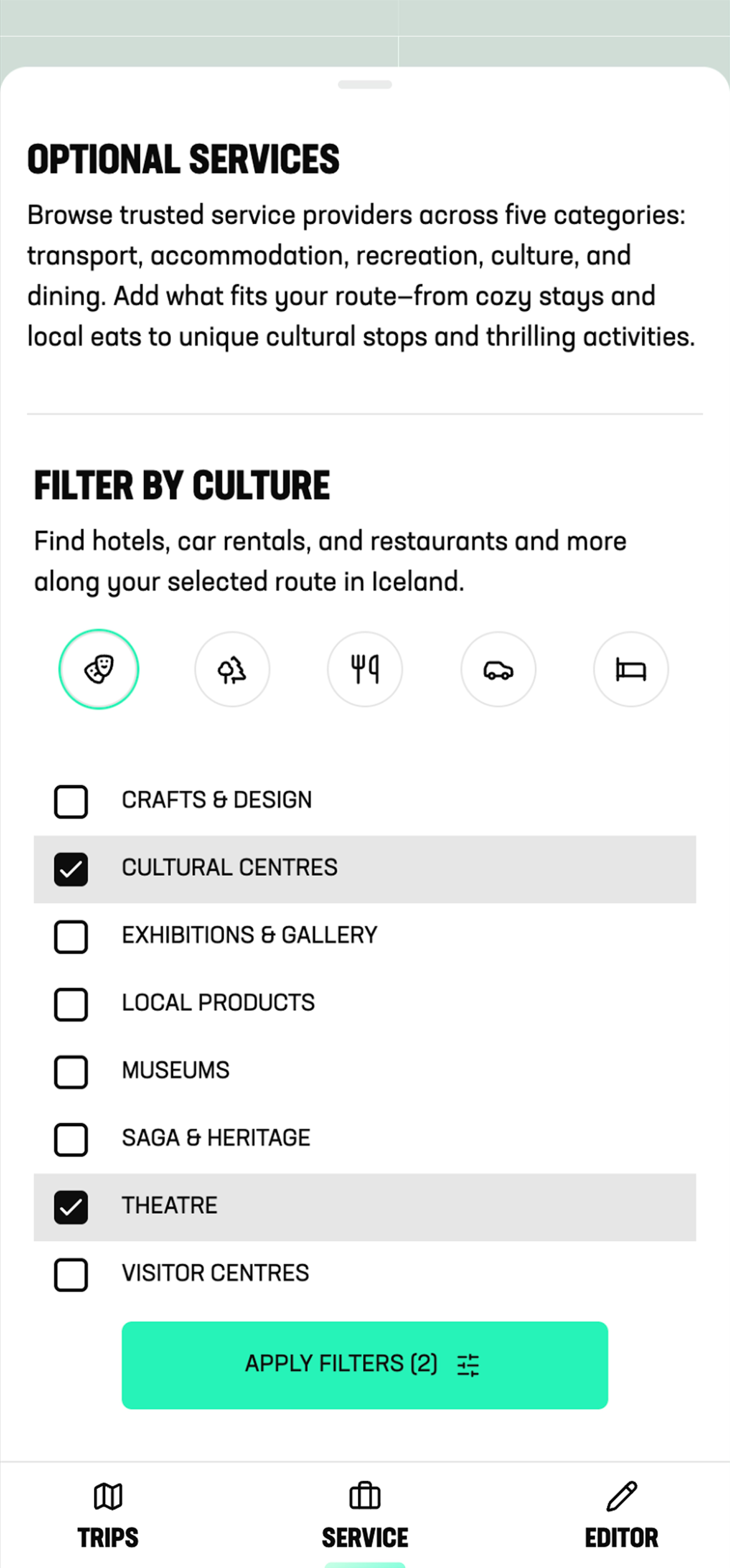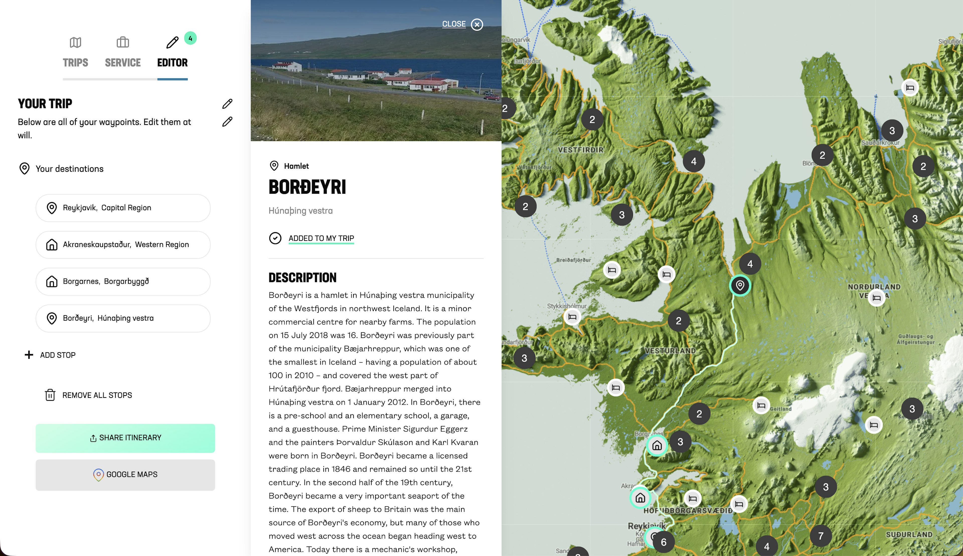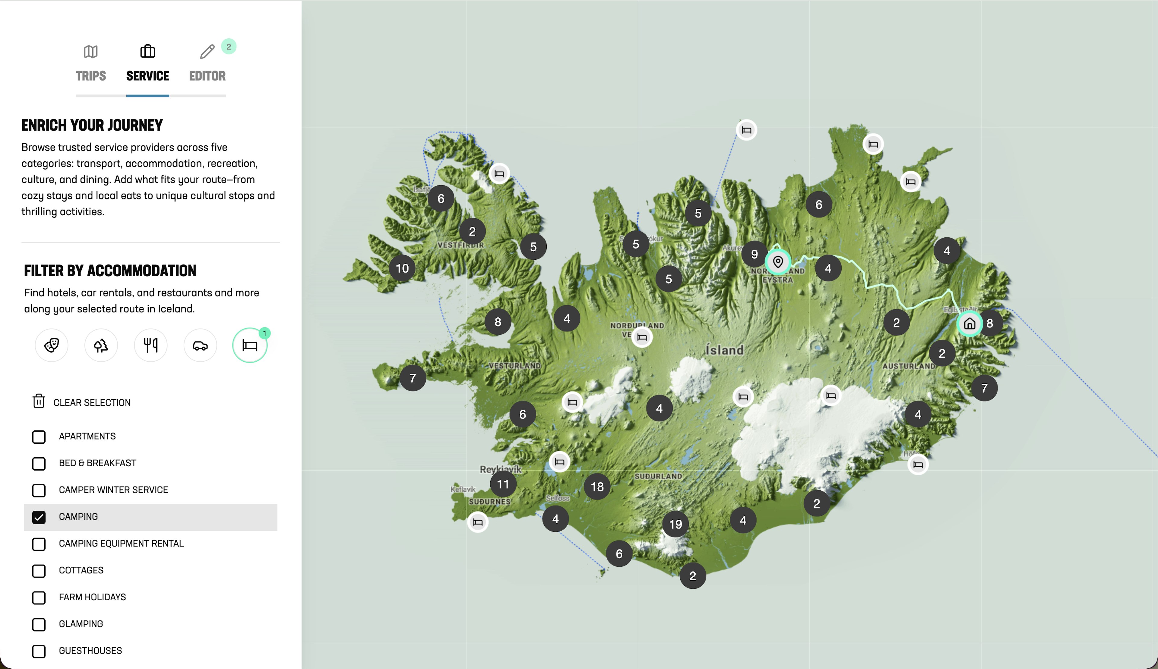 Einn helsti eiginleiki kortsins er gagnvirkt eðli þess. Það er að segja, kortið bíður notandanum upp á að sía út birtar viðbótarupplýsingar, svo sem gistimöguleika, ferðamannastaði, gönguleiðir, tjaldstæði, veitingastaði, bensínstöðvar og þjónustu. Þessi virkni gerir ferðamönnum kleift að skipuleggja ferðaáætlanir sínar á áhrifaríkan hátt, finna viðeigandi gistingu og/eða finna áhugaverða staði út frá óskum þeirra. Enn fremur, með því að nota þessa síur og velja leið frá A til B getur notandinn fengið upplýsingar um allt sem í boði er á þeirri vegferð í 10 km radíus frá valinni leið, valið þá staði sem hann vill stoppa á í sínu ferðalagi, bætt þeim við í ferðaáætlun og deilt þeirri ferðaáætlun með ferðafélögum. Í ferðaáætlun kemur fram leiðin, lengd og tími leiðar, viðkomustaðir og upplýsingar um þá staði, ásamt myndbandi um þá staði sem koma frá “explore Iceland” eða “Upplifðu”.