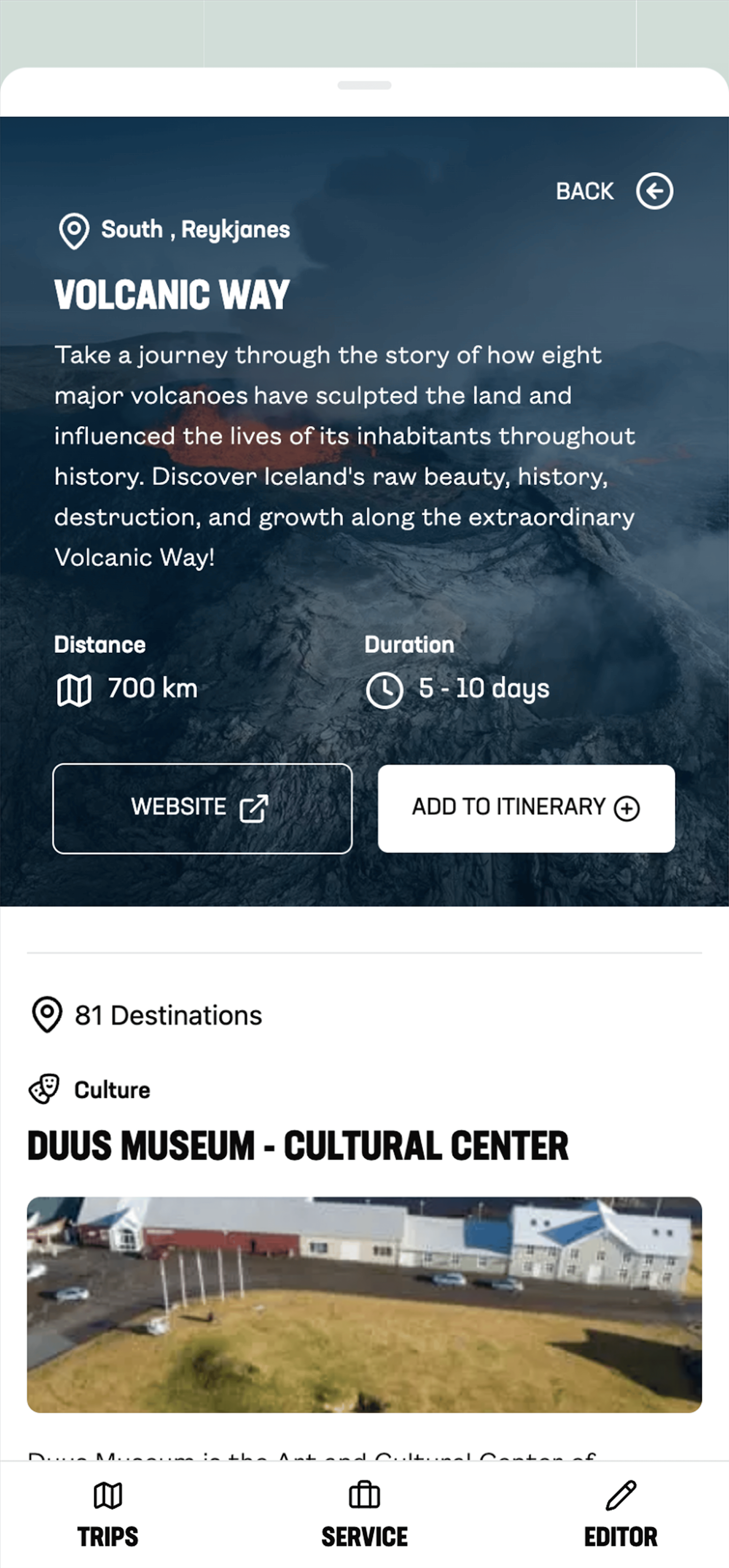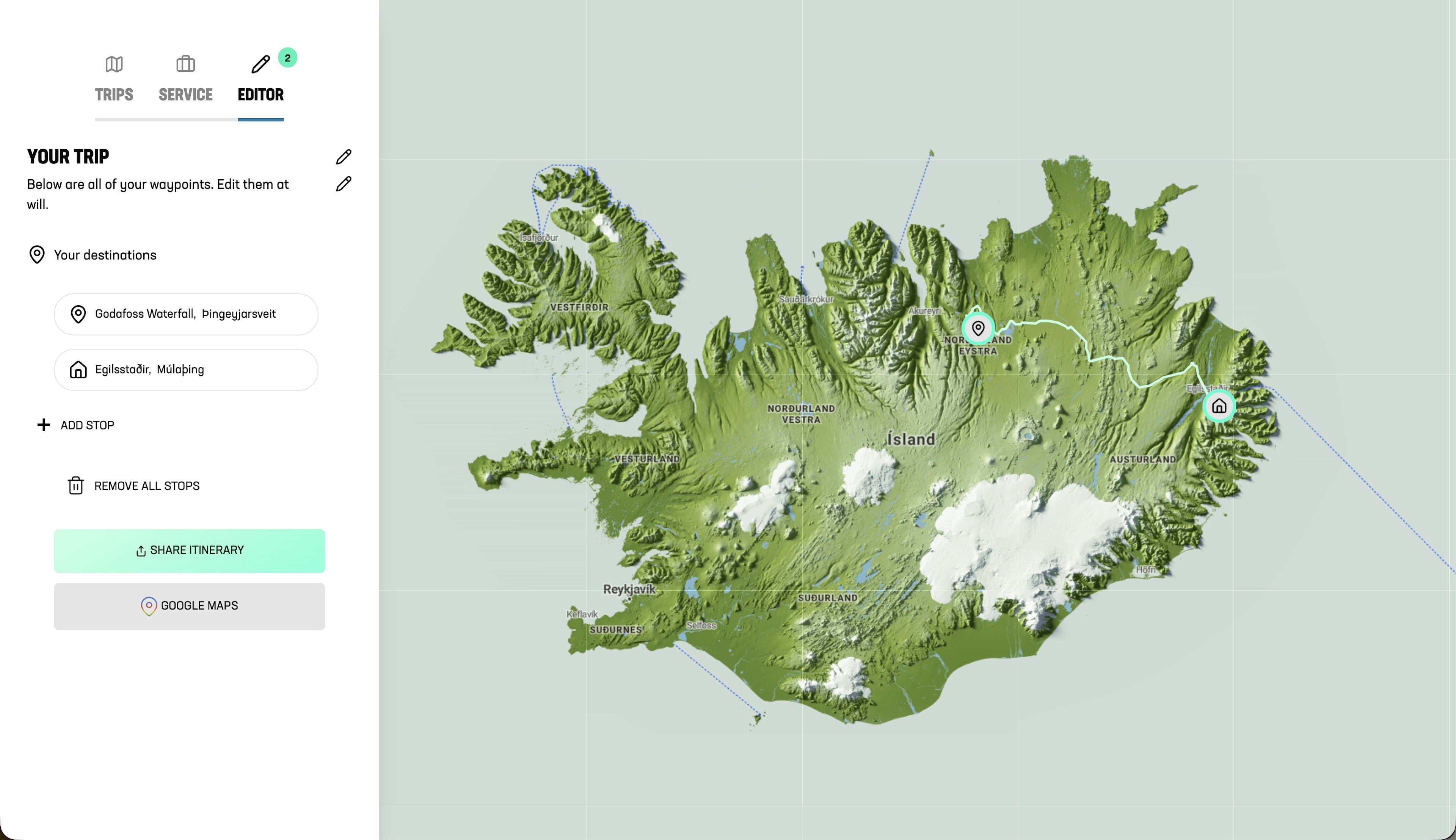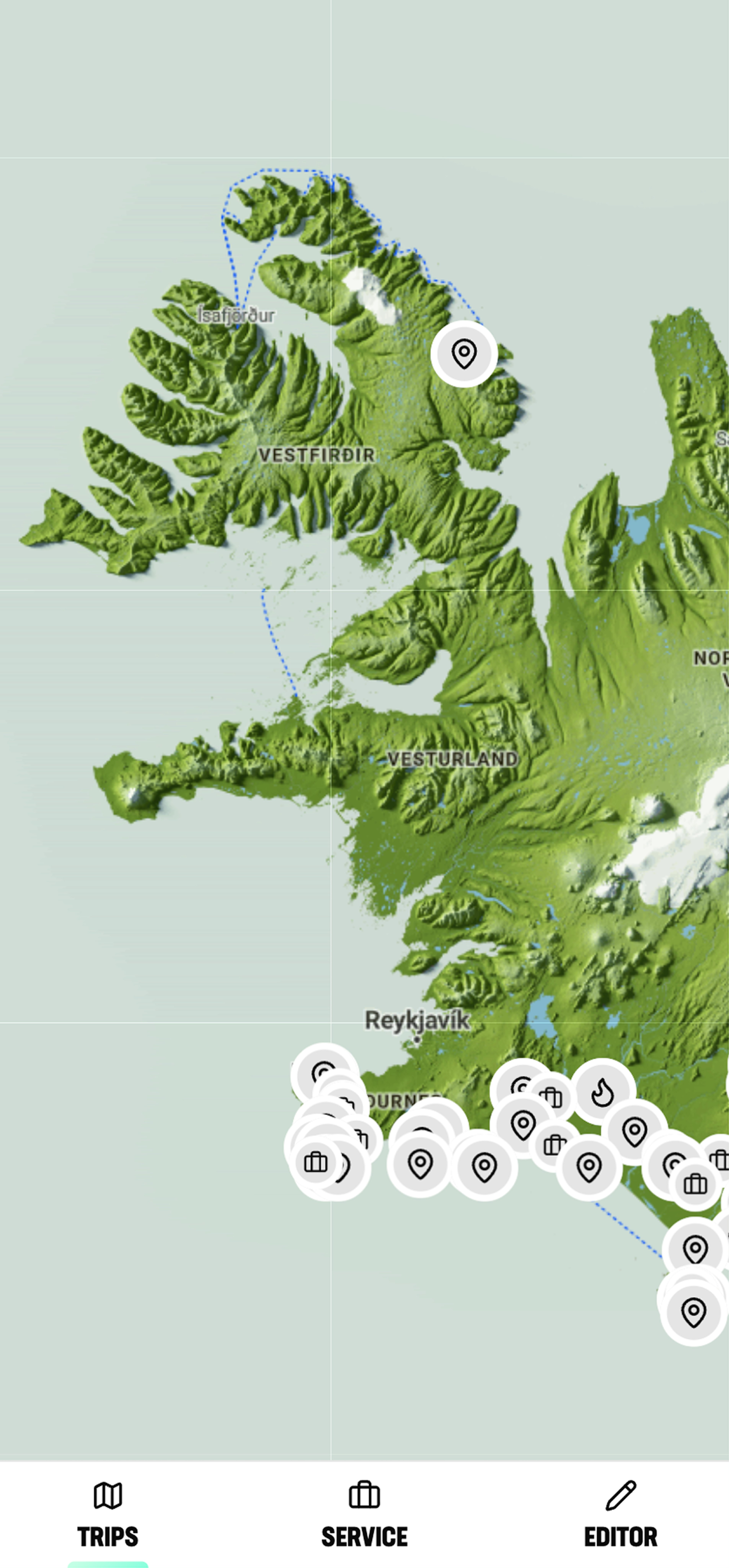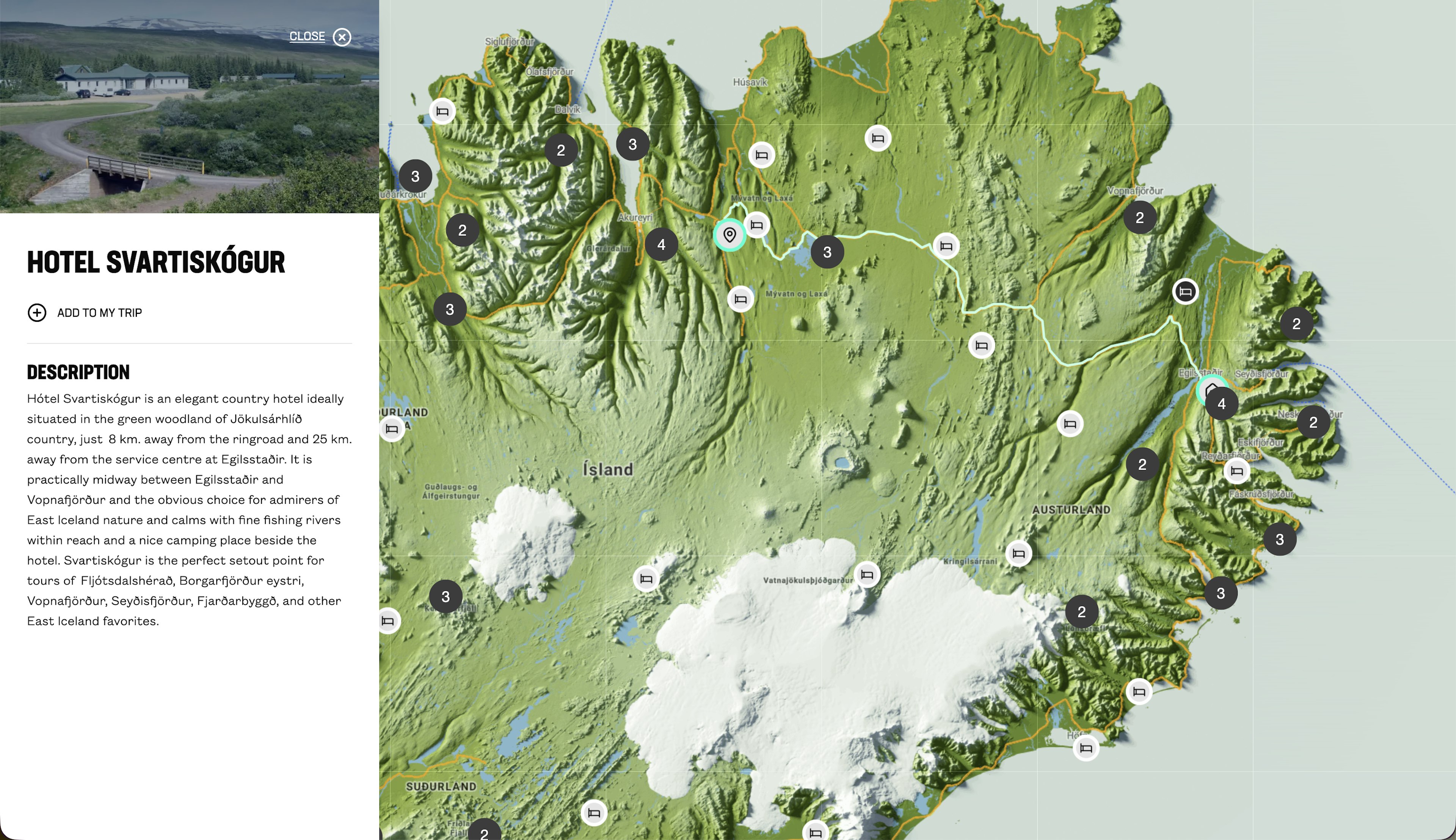 Map of Iceland er gagnvirkt stafrænt kort af Íslandi og er sér verkfæri hannað og þróað fyrir vefsíðuna Visit Iceland, sem er í eigu Íslandsstofu. Hugmyndin var að búa til skemmtilegt og notendavænt tól fyrir ferðalanga Íslands. Við vildum sameina “Upplifðu”, sem er vara í eigu Íslandsstofu, og nokkra fítusa sem nú þegar eru í boði á Visit Iceland, eins og “things to do” og “hleðslustöðvar kortið”. Markmiðið með þessu verkefni var því að búa til vöru sem auðveldar ferðamönnum erlendis frá, jafnt sem heimamönnum að ferðast um landið.